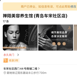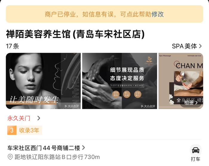 疑似辛莎莎经营的禅陌美容养生馆,在大众点评显示已经永久关闭
