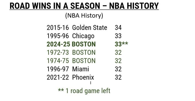 至此,凯尔特人本赛季客场战绩为33胜8负,这在NBA历史上排名第二(和95-96赛季公牛并列),排名第一的是15-16赛季勇士的34胜7负。