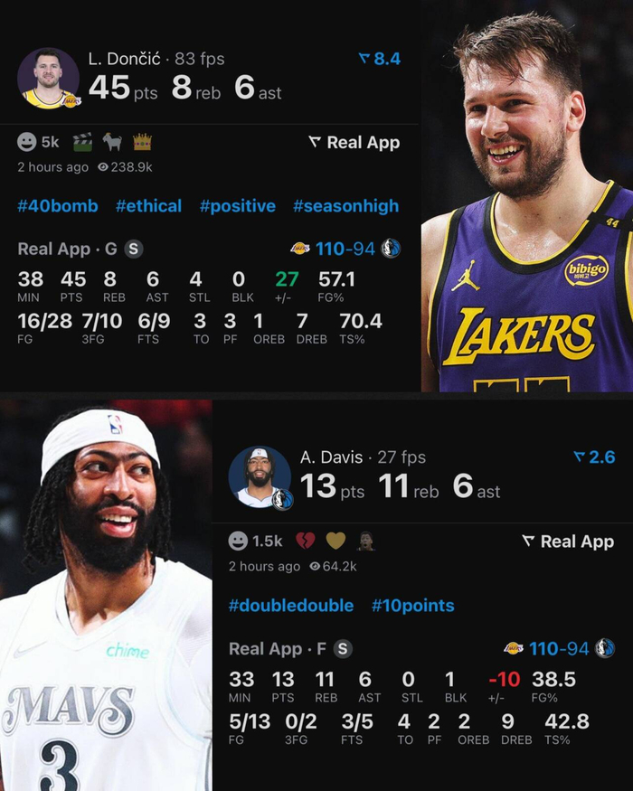 本场比赛,东眉交易主角双双战旧主。东契奇状态爆棚,出战38分钟,28投16中,三分10中7,罚球9中6,砍下45分8篮板6助攻4抢断的豪华数据。浓眉状态不佳,出战33分钟,13投5中,三分2中0,罚球5中3,得到13分11篮板6助攻1盖帽。