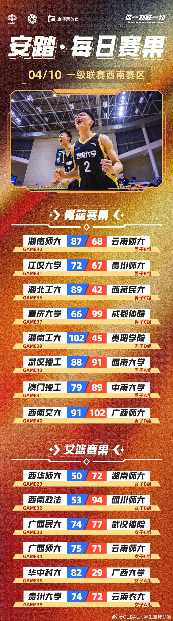 CUBAL每日赛果:西南大学险胜武汉理工 云南师大女篮惜败广西师大