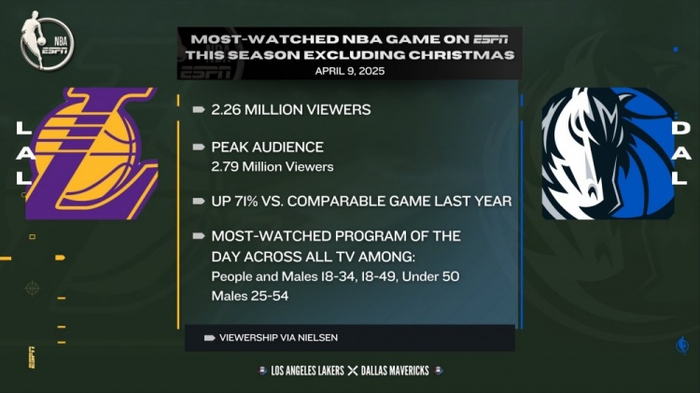 据统计,本场比赛平均观看人数为226万,创下ESPN本赛季除圣诞大战外收视率纪录!