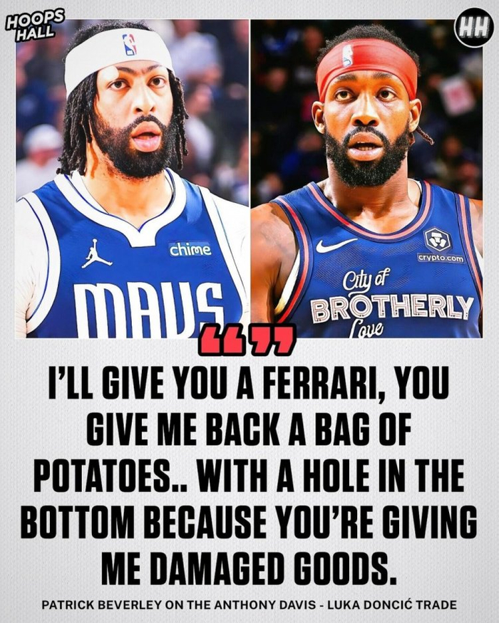 贝弗利激动地表示:“我发现这很有趣。我给你一辆法拉利(东契奇),你却回我一袋土豆(浓眉),袋子底下还破了一个洞,你给了我一个受损产品。”