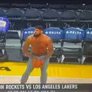 直播吧4月12日讯 今日湖人主场迎战火箭,詹姆斯赛前打赤膊热身。