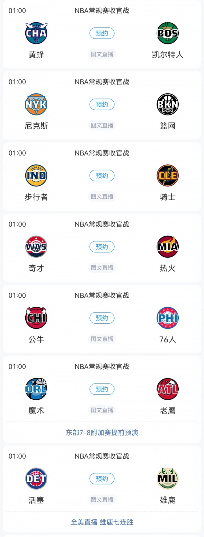 其中东部的七组对决都在凌晨1点开赛,西部的七组对决都在3点半开始。