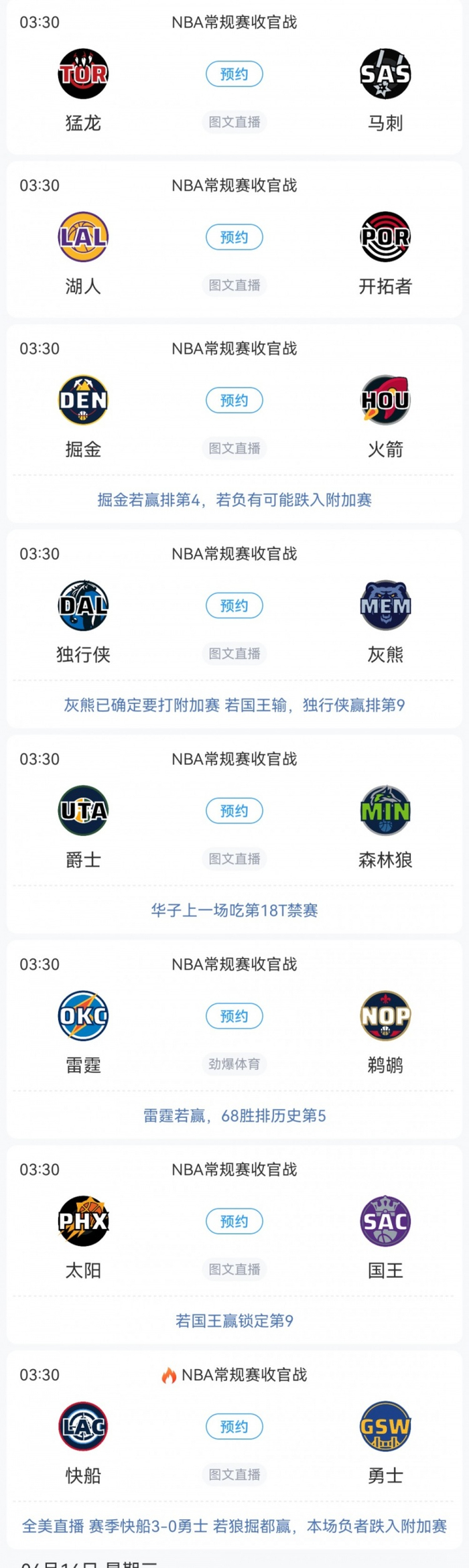 直播吧4月12日讯 NBA明日没有比赛,后天凌晨1点和3点半,30支球队将全部出战。