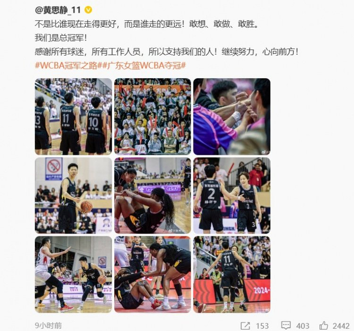 黄思静更博:“不是比谁现在走得更好,而是谁走的更远!敢想、敢做、敢胜。我们是总冠军!感谢所有球迷,所有工作人员,所以支持我们的人!继续努力,心向前方!”