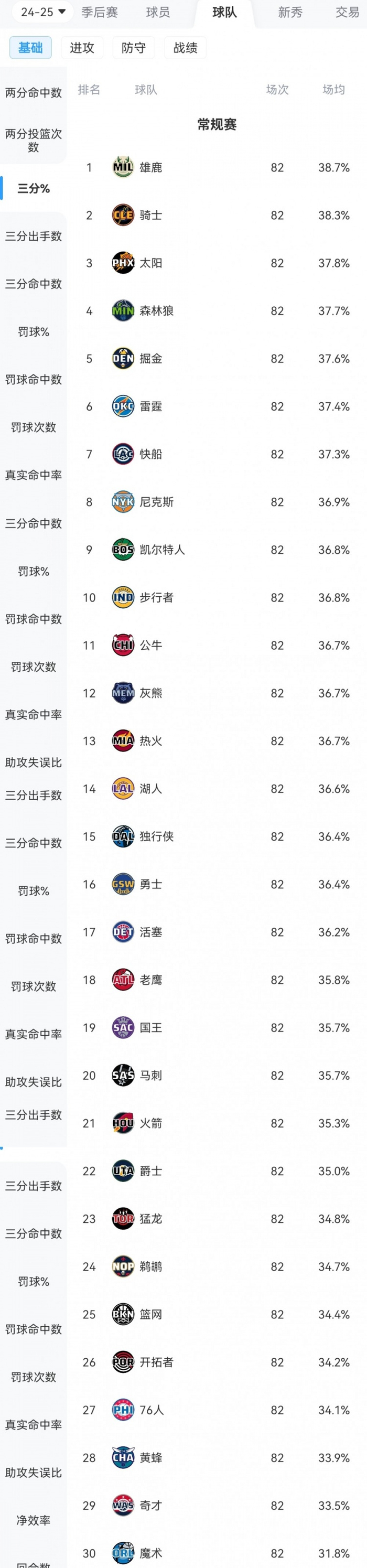 常规赛三分命中率排行:雄鹿最准骑士次之 快船7湖人14勇士16
