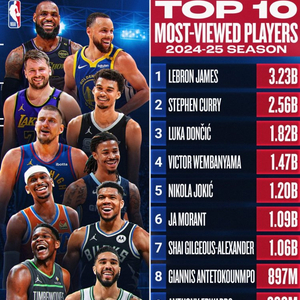 本季社媒浏览量Top10:詹姆斯32.3亿高居第一 库里居次 东契奇第3