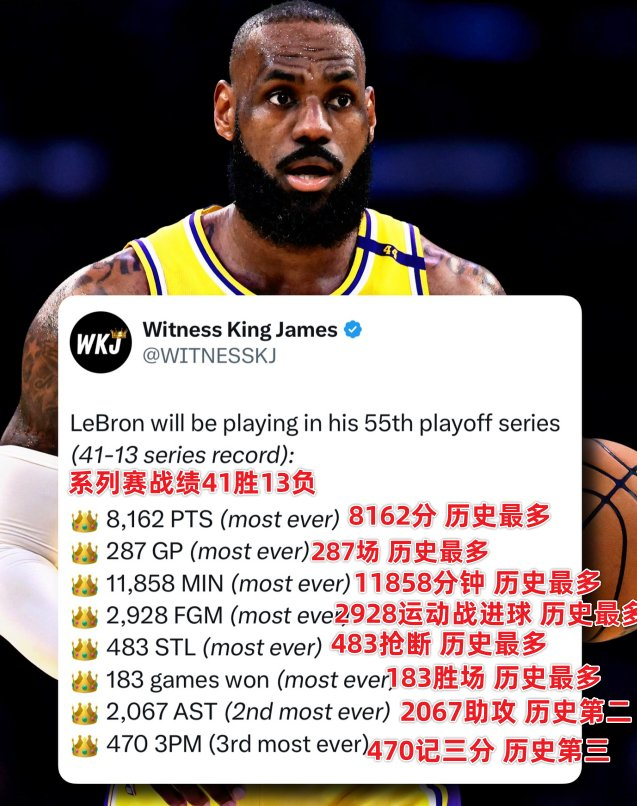 季后赛之王!詹姆斯将开启生涯第55轮系列赛 延续多项历史纪录!