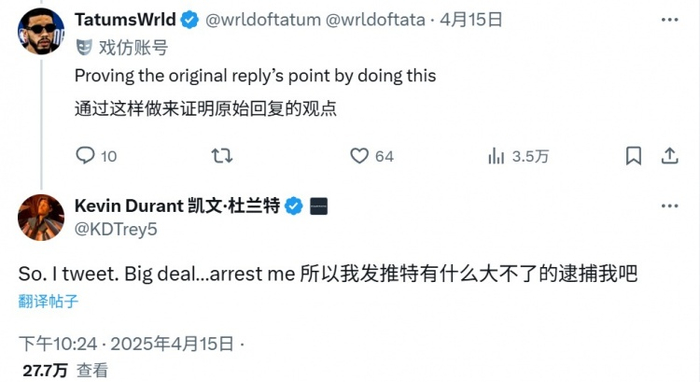 杜兰特回复:“所以呢?我发个推特(又怎么了)?有什么大不了的?来抓我啊。”