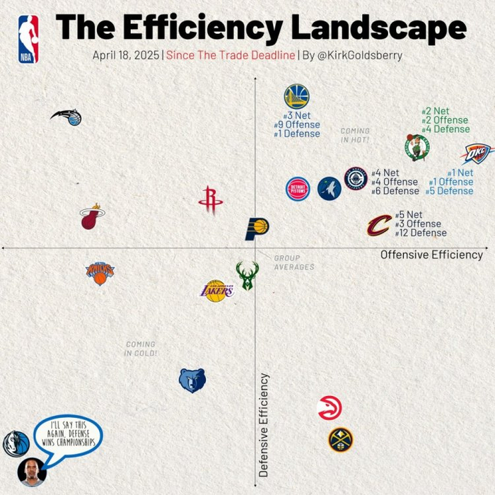 绘图者数据专家Kirk Goldsberry为独行侠配文:“我再说一遍,防守赢得总冠军。”