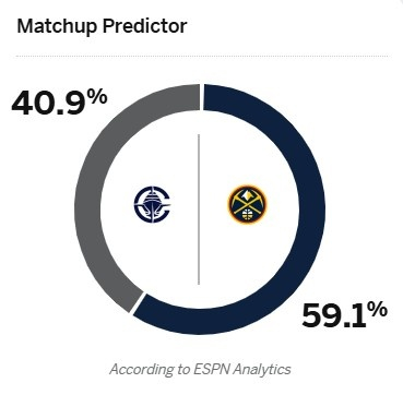 ESPN给出了本场比赛的胜率预测,其中客场作战的快船胜率为40.9%,主场作战的掘金胜率为59.1%。