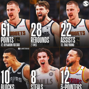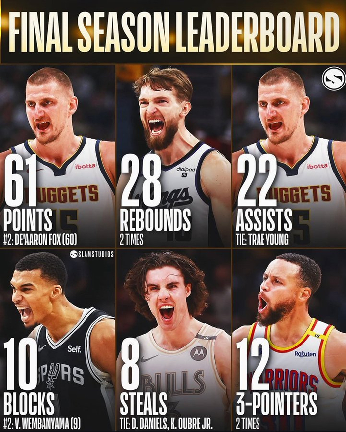 本赛季常规赛各项单场之最:约基奇61分 文班10帽 库里12三分