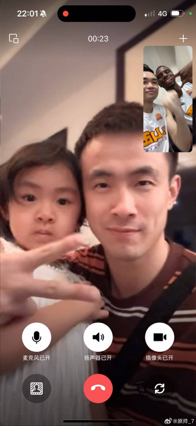 比赛结束后,原帅和好友赵继伟视频连线,继伟旁边还有原帅的女儿。