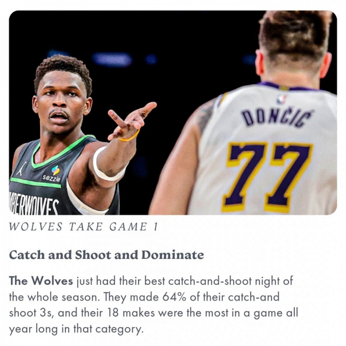本场森林狼全队三分42中21,其中接球三分命中率达到了64%(28中18),单场命中18个接球三分创球队本赛季最佳。