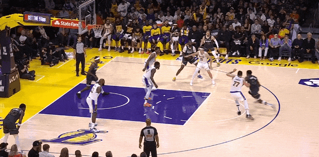 然后就是约基奇今天最成功的一次布局:又是穆雷与约基奇二人转启动,又是邓恩轮转强侧,威少被放空:于是约基奇传给底角威少远射。98比96。