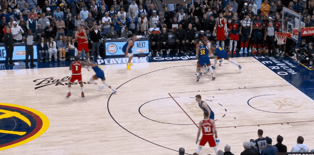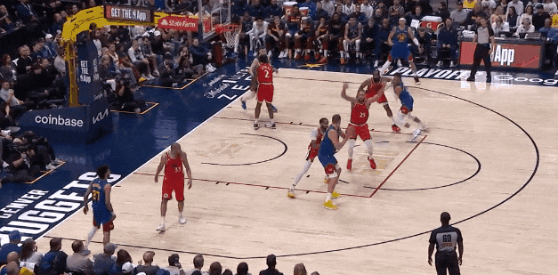 戈登内切带走哈登,约基奇看准邓恩补位强侧,喂弱侧布劳恩射中三分——这一球,邓恩在忌惮威少,所以补位布劳恩才慢了一拍。