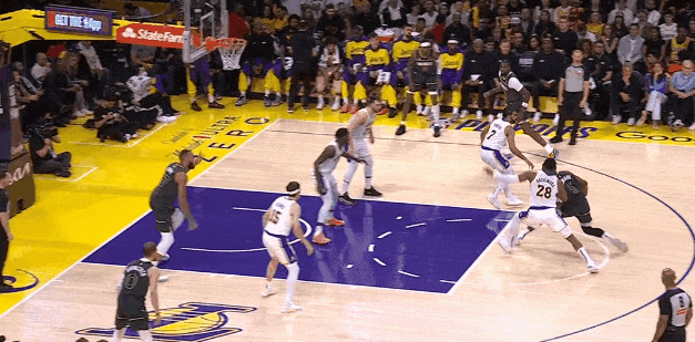 快船最后用莱纳德+祖巴茨对付约基奇+穆雷的二人转,邓恩伺机夹击,三夹二,但对约基奇这级别的天眼视野,快船无球轮转不完美。约基奇喂威少扣篮,和穆雷二人转,喂戈登远射,喂威少内切上篮。