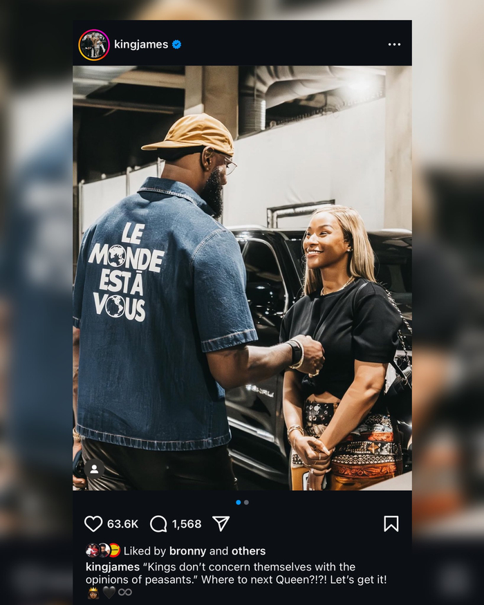 今日,詹姆斯更新了自己的社媒,晒出一张萨凡纳温柔看向自己的照片,并附文回应说:“‘国王不会在乎农民的想法’该如何接近皇后?让我们去吧!👸🏾🖤♾️”