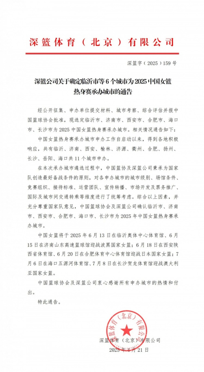 6月13日在临沂奥体中心体育馆、6月15日在济南山东高速篮球馆迎战波黑国家女篮;