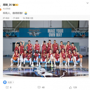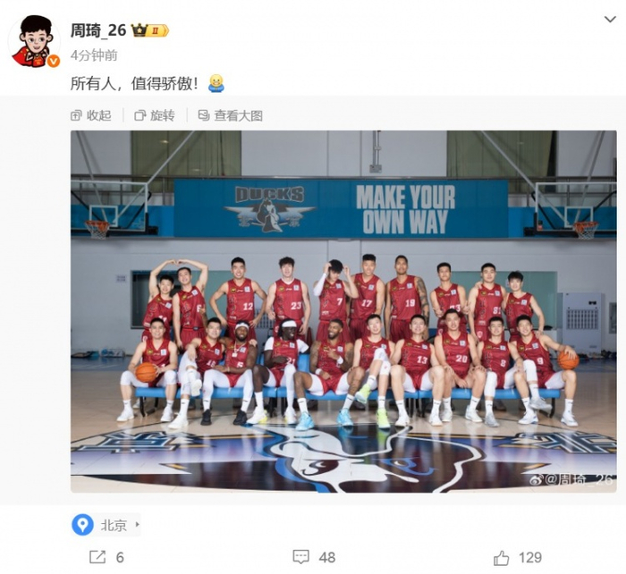 赛后,因伤缺阵的周琦晒出了全队大合照,并写道:“所有人,值得骄傲!”