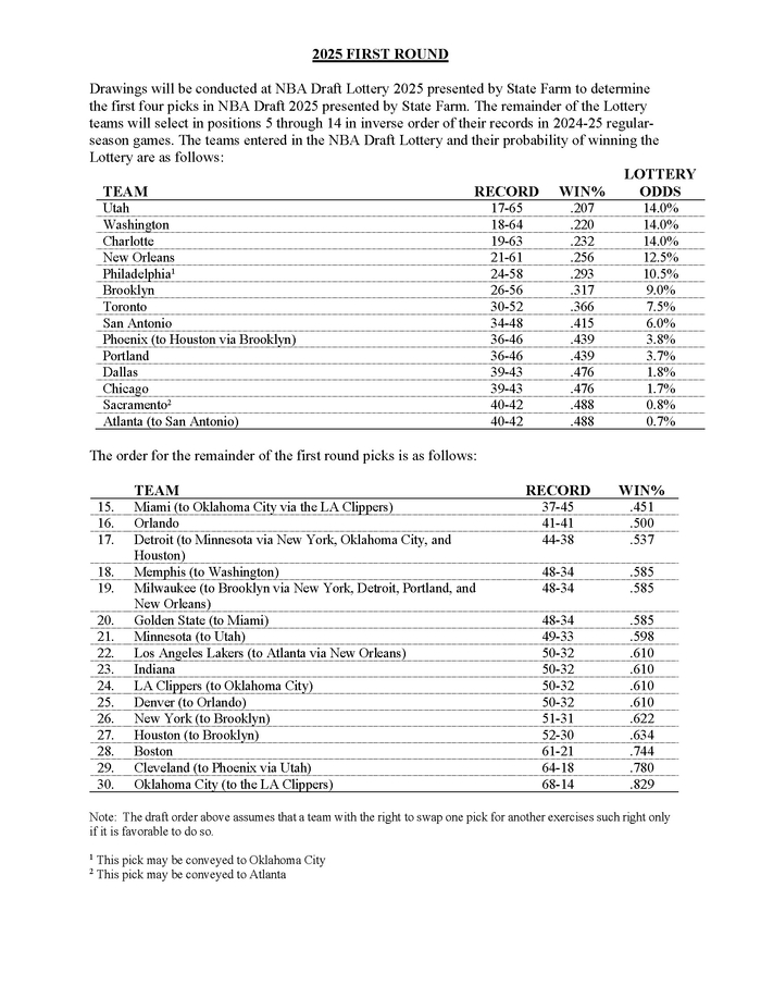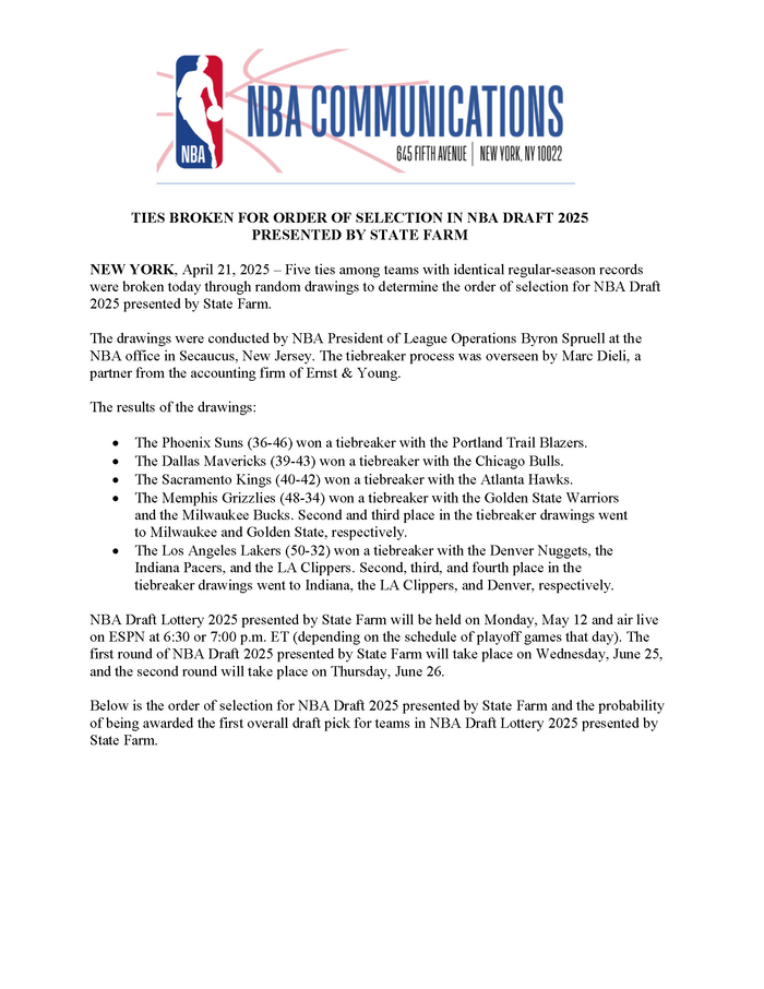 直播吧04月22日讯 NBA官方宣布,联盟通过随机抽签确定了五组常规赛战绩相同球队的选秀顺位。