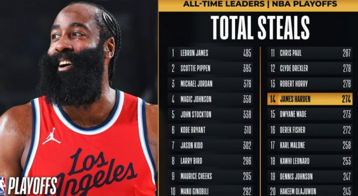 本场比赛之后,哈登季后赛生涯总抢断数来到274次,超越韦德,上升至NBA历史第14位。