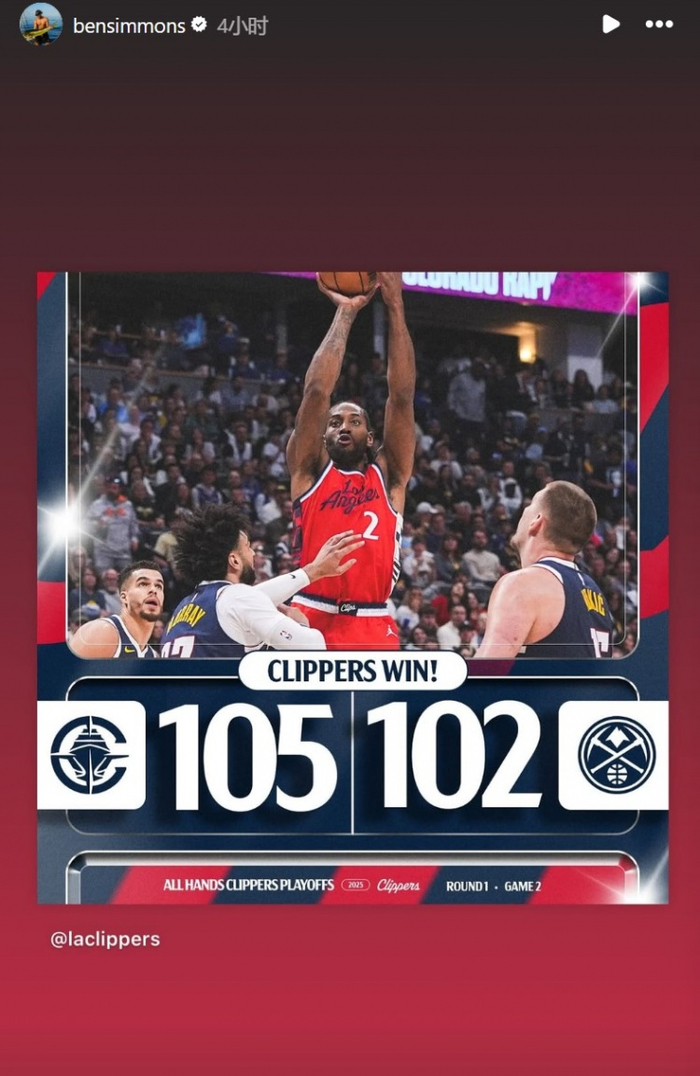 赛后,快船后卫本-西蒙斯转发了球队的赢球海报,其中,莱昂纳德荣登海报封面。