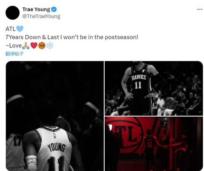 特雷-杨写道:“亚特兰大!七年过去了,这会是我最后一次没进季后赛!爱🙏🏽❤️🏀❄️”
