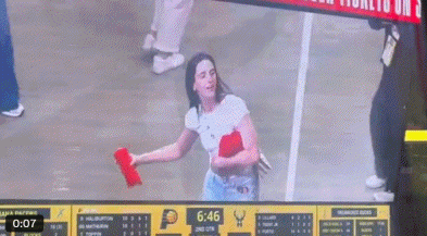印第安纳狂热队球员凯特琳-克拉克 (Caitlin Clark)、阿莉亚-波士顿 (Aliyah Boston) 和凯尔西-米切尔 (Kelsey Mitchell) 到场观看步行者队与雄鹿队的G2,帮忙向球迷们扔球迷送礼物。