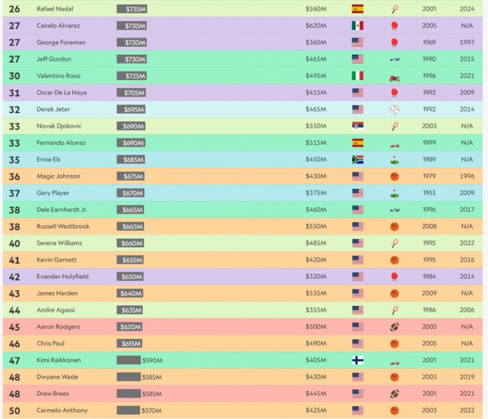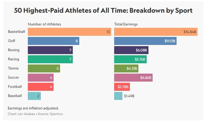 而在榜单前50中,篮球运动员一共13个,占比最多,共计收入148.4亿美元,高尔夫第二(8个)。