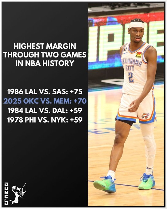 统治级!雷霆系列赛前两场净胜70分 排名历史第二&仅次于86湖人