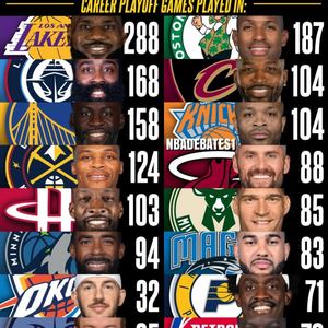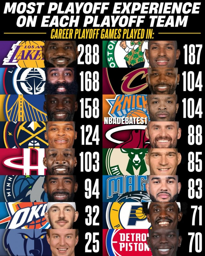 各队最有季后赛经验球员:老詹288场哈登追梦在列 一队最多仅25场