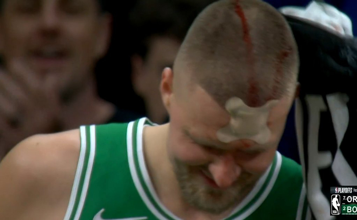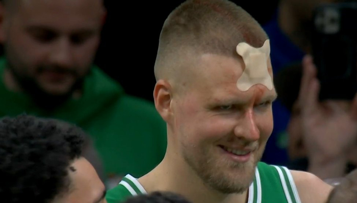 波尔津吉斯被肘击后头上贴了一个“XXL”号创可贴 自己都笑了😅