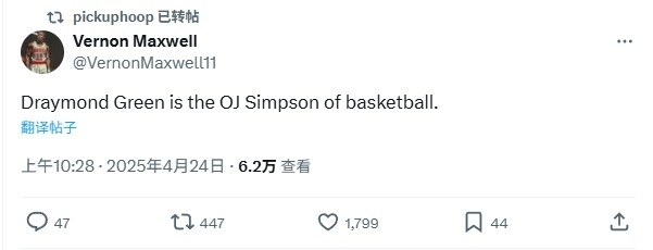 直播吧4月24日讯 火箭VS勇士系列赛G2,火箭名宿弗农-马克斯维尔发推点评追梦。