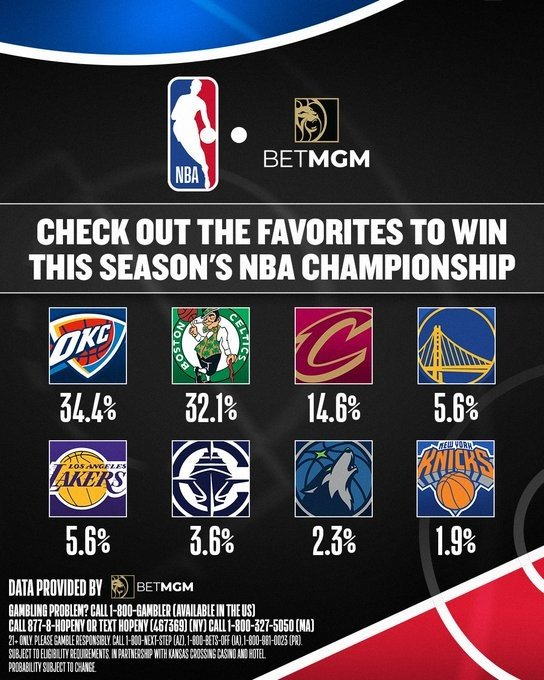 本赛季夺冠概率:雷霆34.4%居首 绿军32.1%居次 勇士&湖人5.6%