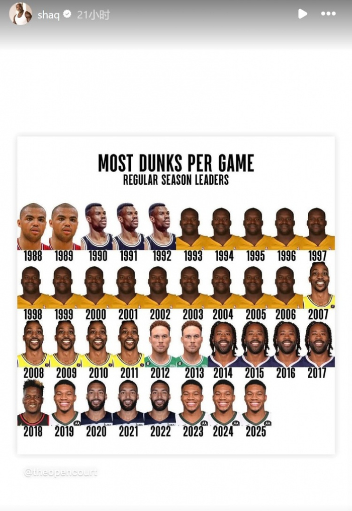奥尼尔转发1988年以来每赛季场均扣篮领跑者 自己连续14年霸榜