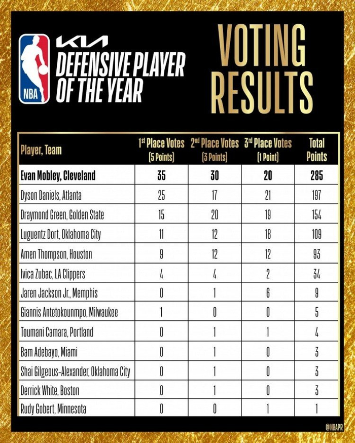 直播吧4月25日讯 今日NBA官方宣布,骑士球员埃文-莫布里当选本赛季NBA最佳防守球员!