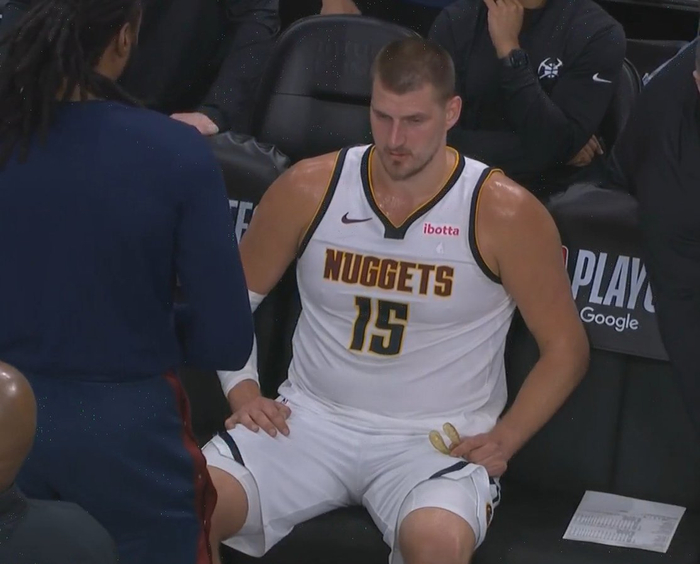 大桶百岁山又回来了约基奇坐在板凳上 肉肉把球衣挤到变形