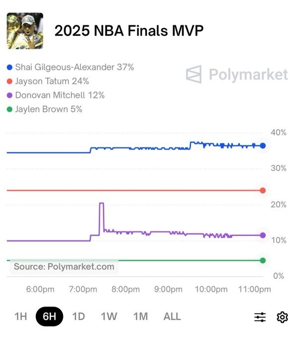 直播吧4月25日讯 美媒Polymarket预测了今年总决赛MVP得主,具体如下: