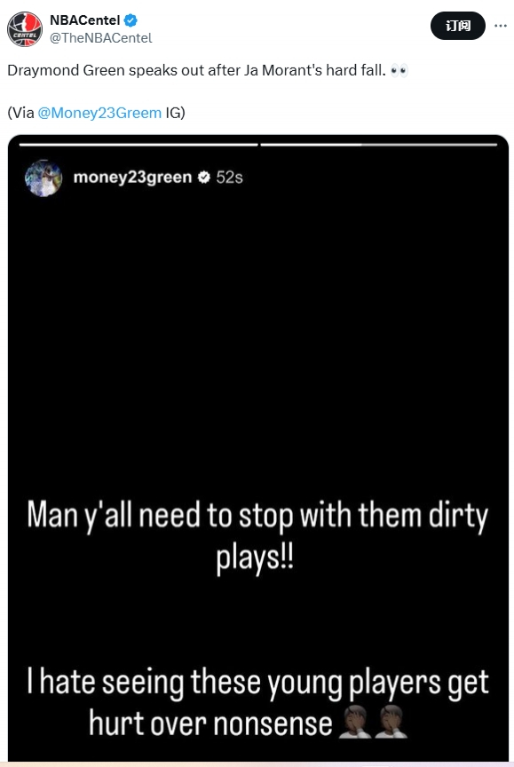 直播吧04月25日讯 今日著名假账号NBA Centel在莫兰特受伤后,发文伪造德雷蒙德-格林发言:“你们要停止那些脏动作了我痛恨看到年轻人离谱地受伤。”