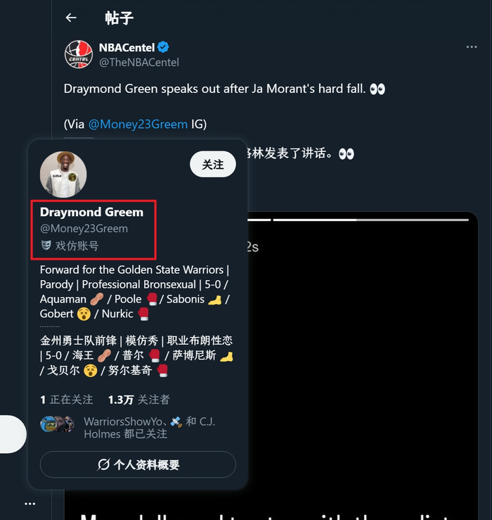 德雷蒙德-格林账号也是戏仿的假账号