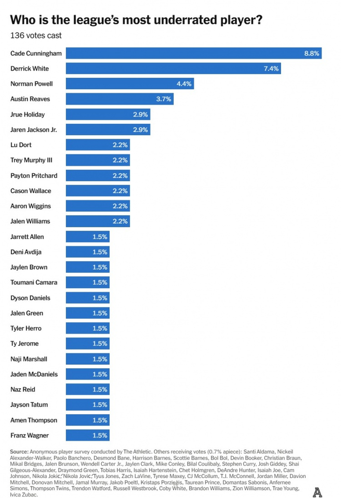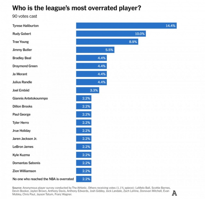 (投票结果:哈利伯顿14.4%、戈贝尔10%、特雷-杨8.9%、巴特勒5.5%、比尔&追梦&莫兰特&兰德尔4.4%、恩比德3.3%、字母哥&狄龙&乔治&希罗&朱-霍勒迪&JJJ&詹姆斯&库兹马&小萨&锡安&联盟中没人被高估2.2%)