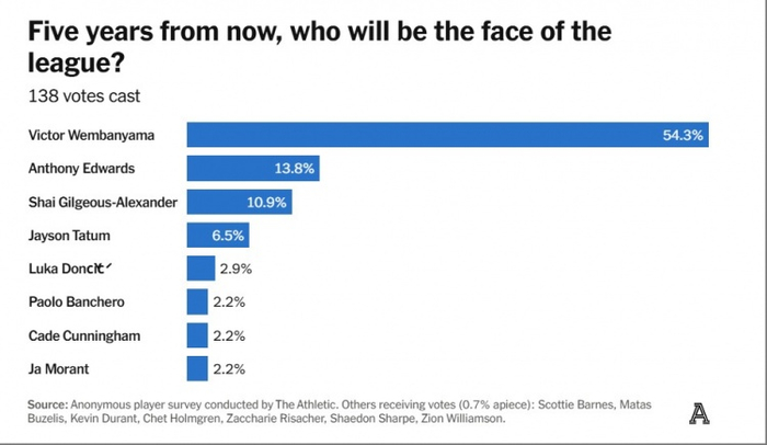 (投票结果:文班亚马54.3%、爱德华兹13.8%、亚历山大10.9%、塔图姆6.5%、东契奇2.9%、班凯罗&康宁汉姆&莫兰特2.2%)