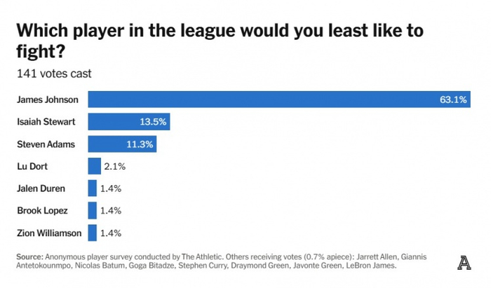 虽然约翰逊的硬汉统治地位引人注目,但今年还有一个值得关注的新发现:活塞的以赛亚-斯图尔特——绰号“牛肉炖”——已经超越了火箭的大个子史蒂文-亚当斯,成为联盟中第二令人恐惧的球员。这一称号对斯图尔特来说是迟早的事,他曾于2021年11月21日全场追打勒布朗-詹姆斯,并因此获得了一票。