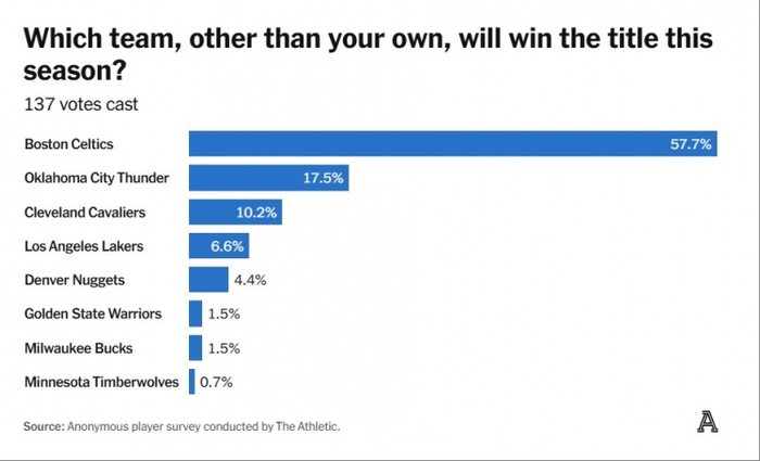 (投票结果:凯尔特人57.7%、雷霆17.5%、骑士10.2%、湖人6.6%、掘金4.4%、勇士&雄鹿1.5%、森林狼0.7%)
