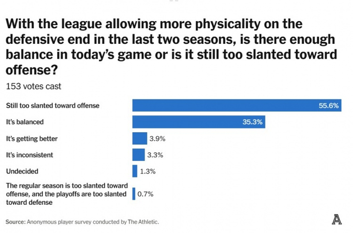 现在,经过一个完整的赛季后,大多数受访球员认为比赛仍然过于偏向进攻方。