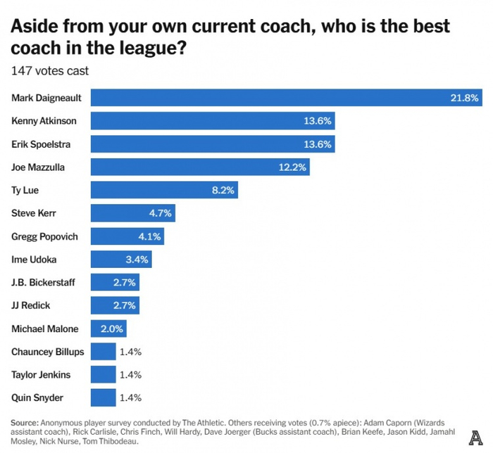 值得一提的是,大多数接受采访的球员都拒绝回答这个问题。其中一位球员说:“我不回答是因为,我认为现在的教练们都很优秀。你可以选择一个垫底球队的教练,比如(某支表现不佳的球队的教练),但我曾经在他手下打球,他很好,这(战绩差)并不是他的错。”