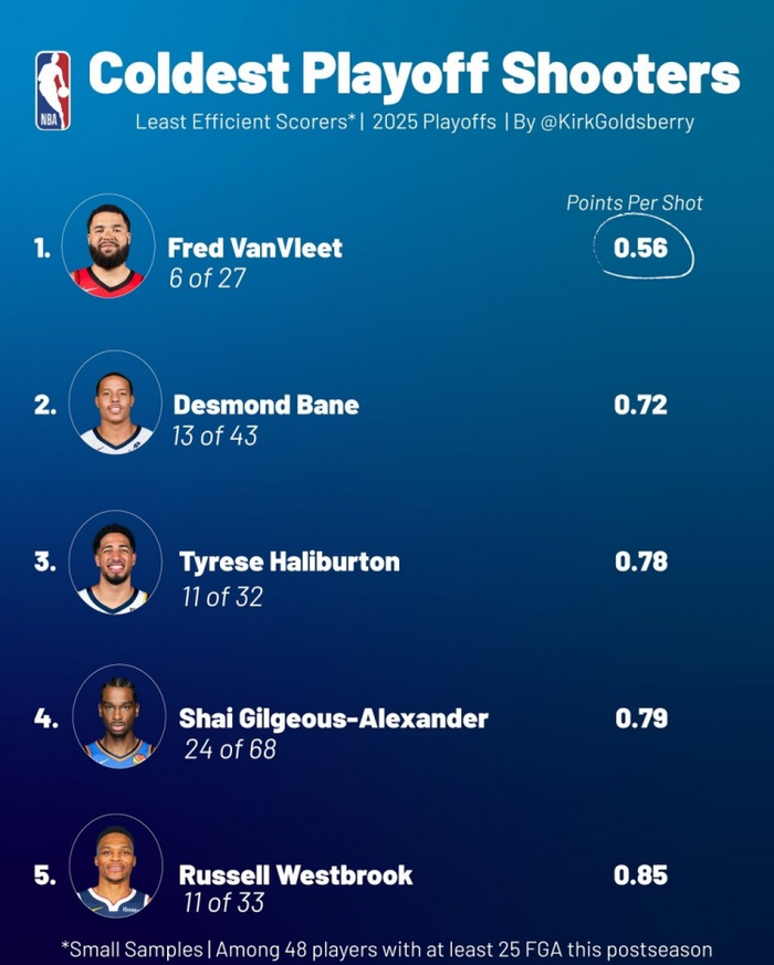 季后赛最低效投手:范乔丹每次投篮得0.56分最差 SGA第4&威少第5