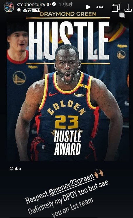 库里转发追梦海报向好兄弟发来祝贺:“致敬@追梦🙌!对我来说你绝对就是年度最佳防守球员,期待(入选)防守一阵!”